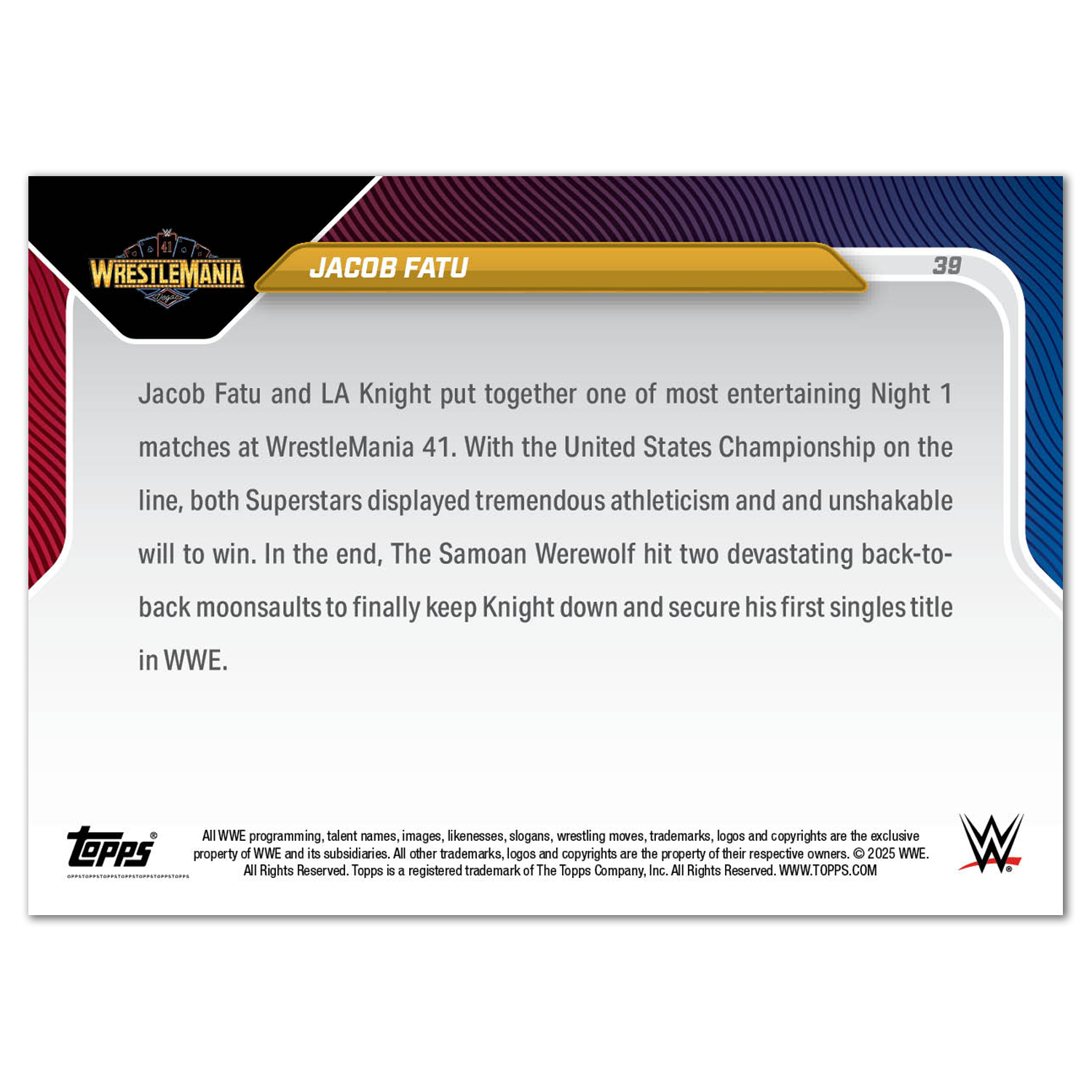 Jacob Fatu - 2025 WWE Topps NOW® - Card 39 - LOOK FOR AUTOS