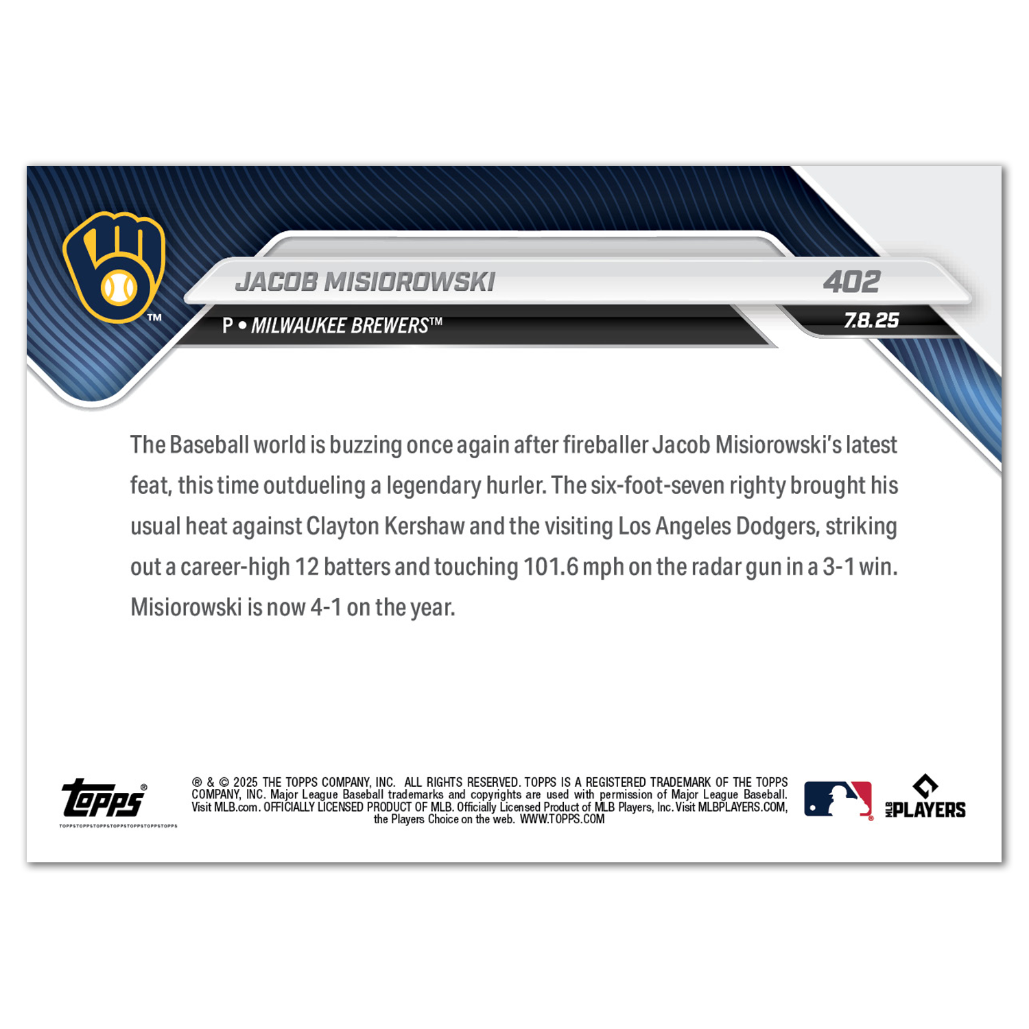 Jacob Misiorowski - 2025 MLB Topps NOW® - Card 402 - LOOK FOR AUTOS