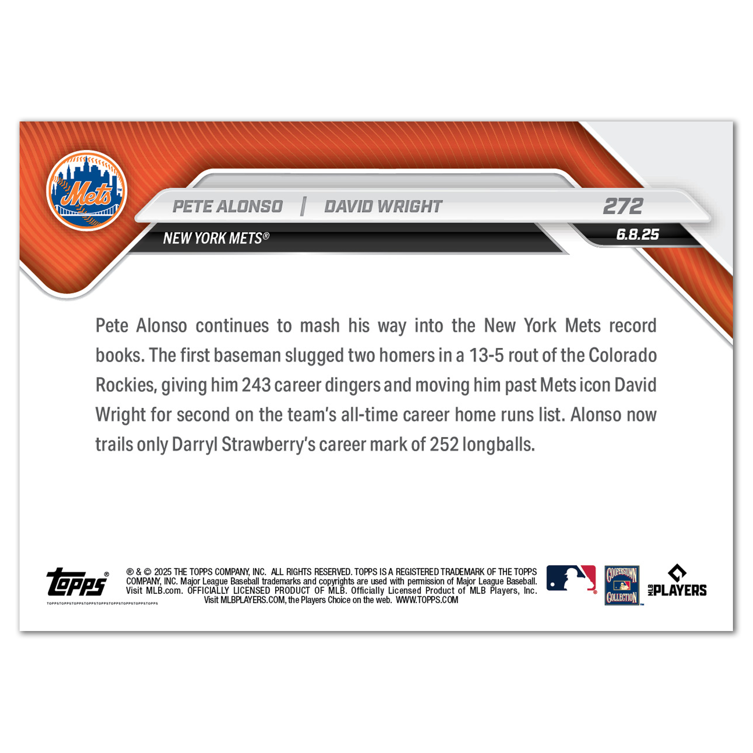 Pete Alonso / David Wright - 2025 MLB Topps NOW® - Card 272